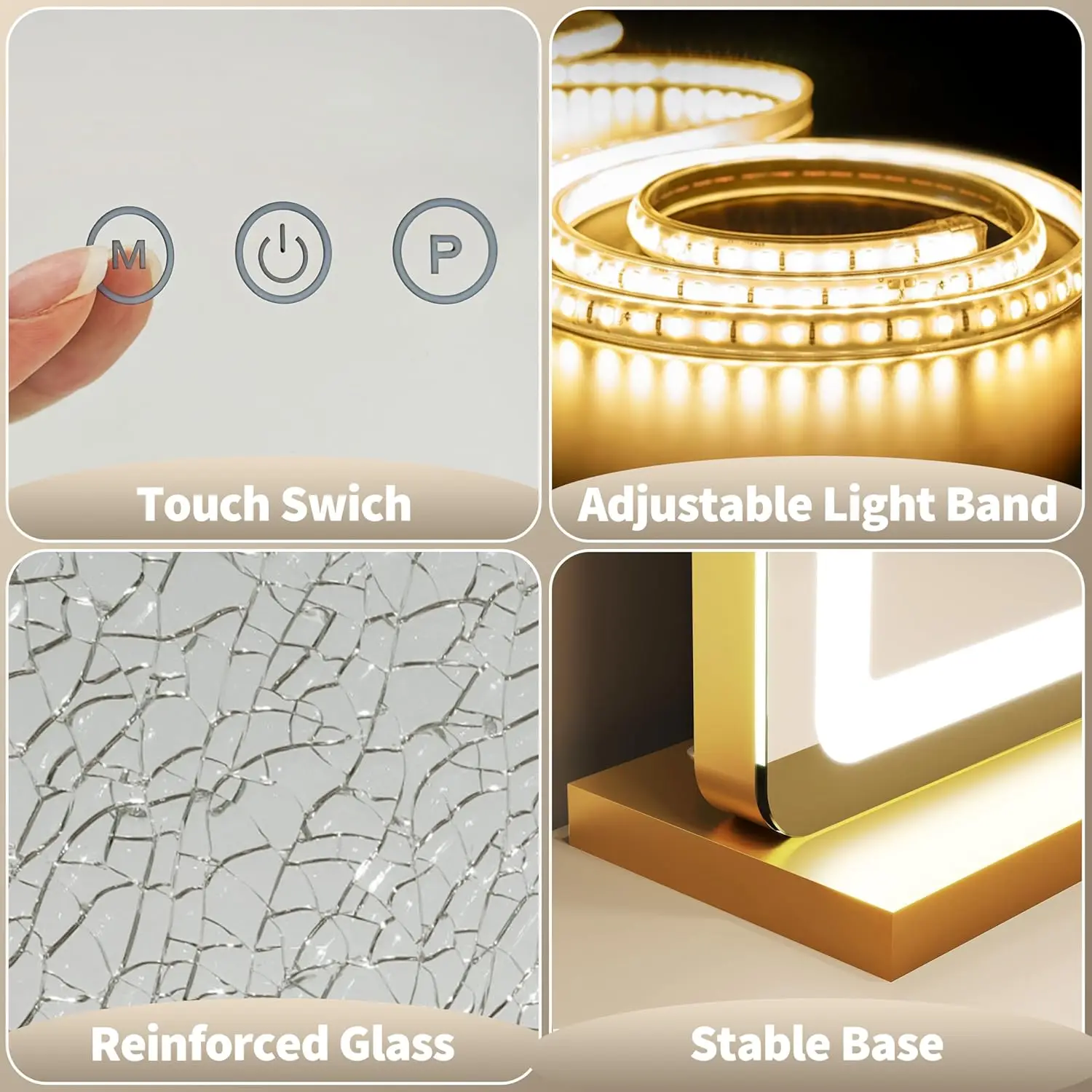 Enhance your beauty routine with our premium Hollywood-style vanity mirror. This elegant piece features a spacious 23-inch by 18-inch design, perfect for detailed makeup application and grooming. Key highlights include: 1. **Advanced LED Lighting**: Equipped with energy-efficient LED lights that provide bright, natural illumination to mimic daylight, ensuring flawless makeup results every time. 2. **Customizable Color Modes**: Choose from three distinct color settings—warm white, cool white, and natural light—to suit different lighting needs and preferences for various occasions. 3. **Adjustable Brightness Control**: Easily dim or brighten the lights with a simple touch control, allowing you to create the perfect ambiance for any task, from subtle touch-ups to full glam looks. 4. **Stylish Gold Finish**: Crafted with a sleek gold frame that adds a touch of luxury to any vanity or bathroom decor, blending seamlessly with modern interiors. 5. **User-Friendly Design**: Features a stable base and adjustable tilt mechanism for optimal viewing angles, making it convenient for daily use without straining your posture. 6. **Versatile Application**: Ideal for home use in bedrooms, bathrooms, or dressing areas, as well as professional settings like salons or photography studios. 7. **Durable Construction**: Made from high-quality materials to ensure long-lasting performance and resistance to wear and tear. 8. **Easy Setup and Maintenance**: Comes with simple assembly instructions and requires minimal upkeep—just wipe clean with a soft cloth to maintain its shine. This mirror is designed to elevate your self-care experience by combining functionality with aesthetic appeal.